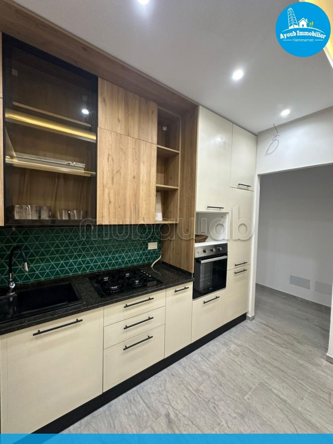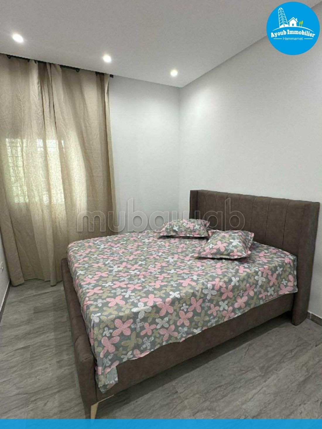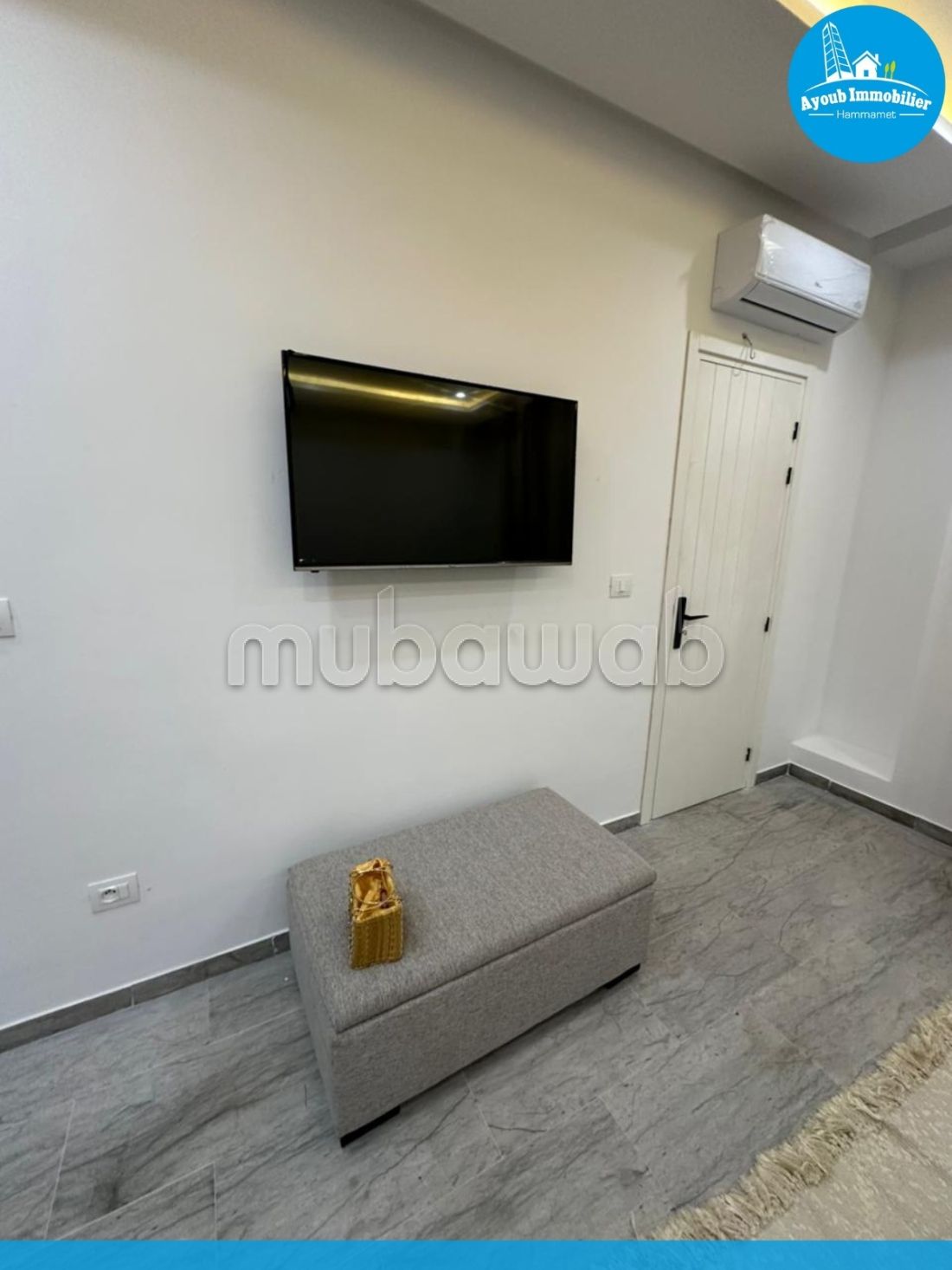 Studio for annual rent in Hammamet Corniche area, 300m from the sea. It consists of a bright living room opening onto a balcony, a bedroom, a bathroom, and a fitted kitchen. Price: 1,100 dt per month.