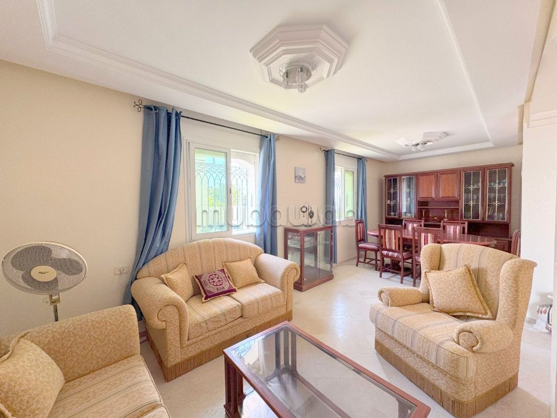 The ground floor consists of a spacious living room, a dining room, a fully equipped kitchen opening onto a balcony, a versatile bedroom, and a guest washroom.