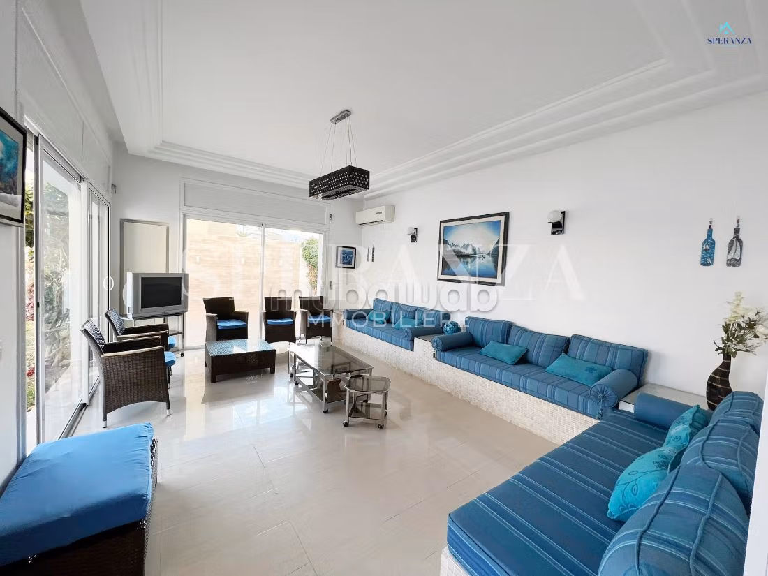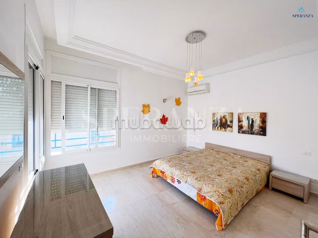 Location annuelle chez Speranza immobilière Hammamet Cette villa avec un style contemporain dans un quartier résidentiel et calme 5min à la plage de Hammamet sud. Dans la partie extérieure on trouve une entrée avec un jardin gazonné et piscine qui entoure la villa avec un coin barbecue . Au partie intérieur on trouve deux salons style loft et salle à manger qui possèdent un accès à la terrasse. La cuisine est bien équipée avec tout le rangement nécessaire (plaque de cuisson, d'une hotte aspirante et d'un four encastré), et complétée par un coin repas. Une salle d'eau, une suite parentale ,trois chambres à coucher, meublées par des dressings avec une salle de bain commune. La villa est équipée de chauffage central et de climatisations .Un garage qui peut contenir deux voitures.