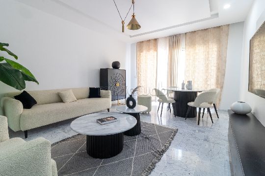 À louer à l’année, un bel appartement S3 non meublé à Hammamet, dans un cadre résidentiel paisible loin du tumulte du centre ou des zones très touristiques avec des voisins stables adressé pour des personnes ayant besoin d’espace (travail à domicile, invités…). L’appartement offre un espace de vie confortable, trois chambres (dont une suite), un salon, une salle à manger, une salle de bain, une cuisine bien aménagé, un jardin agréable et une plac...