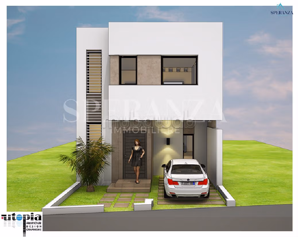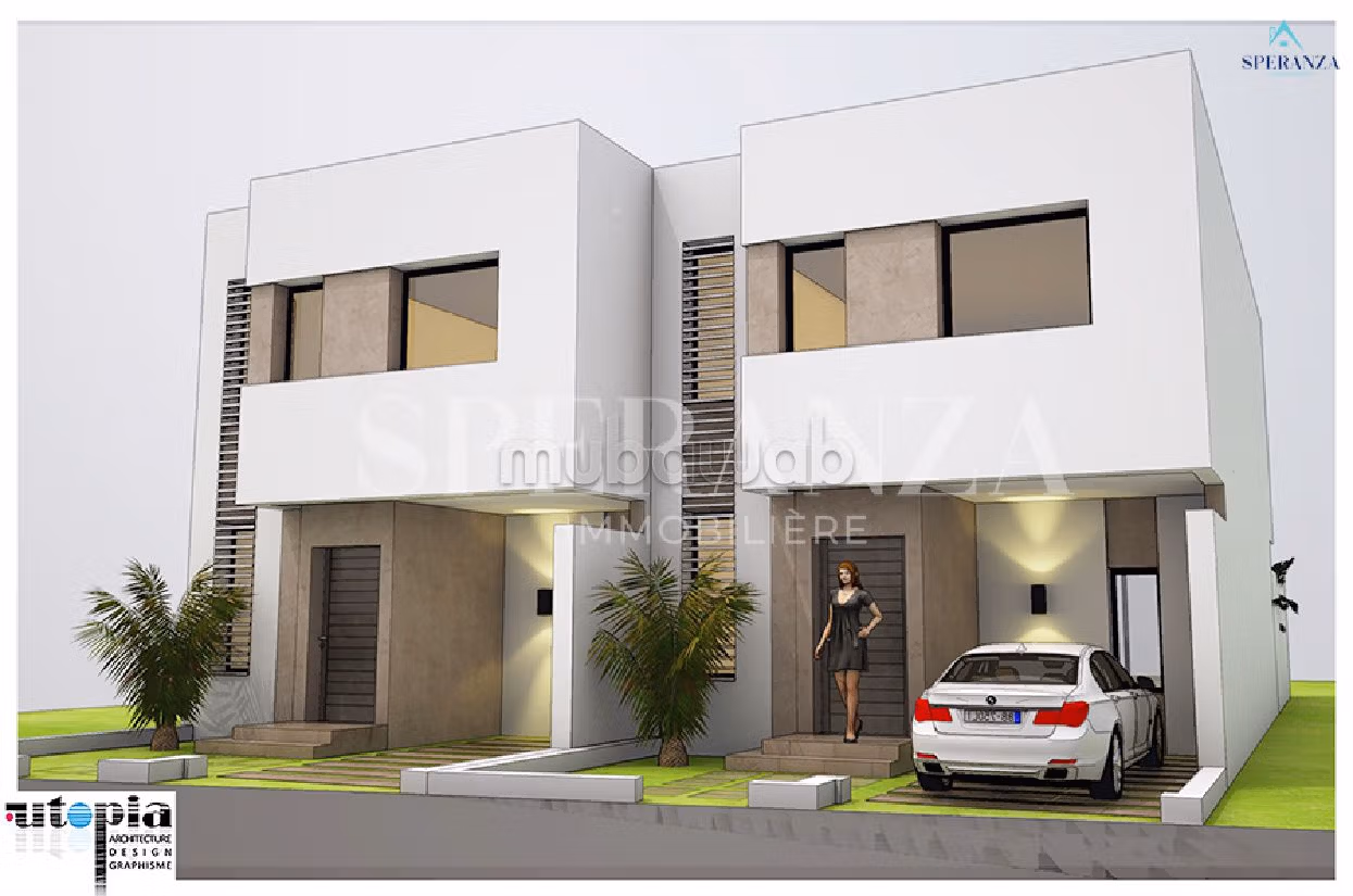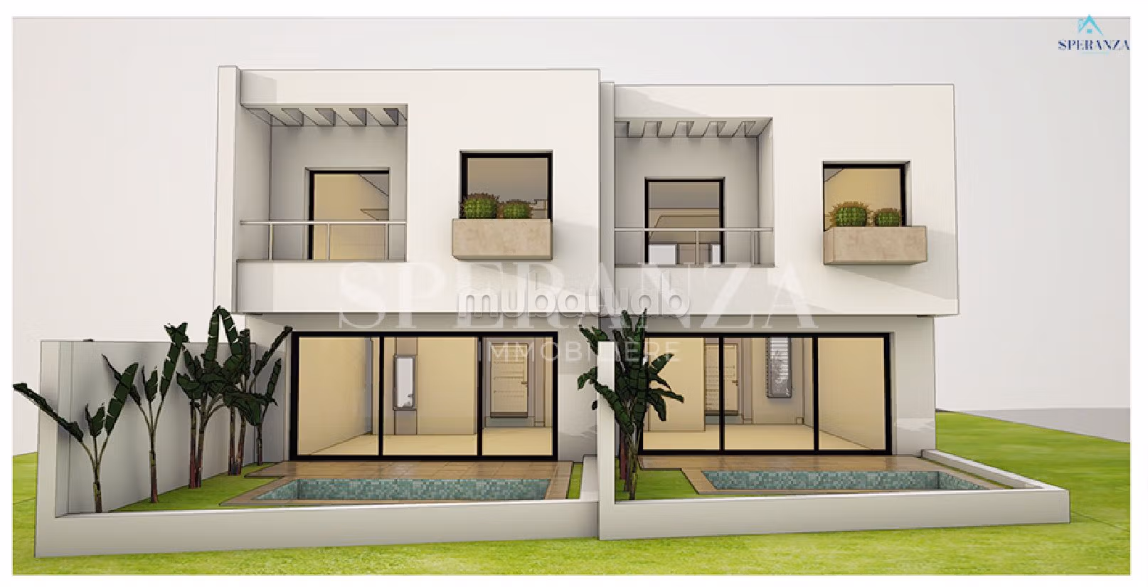 Speranza immobilière Hammamet vous propose à la Vente Deux duplex jumelées à vendre se situe à Hammamet Nord, dans un quartier calme et à la fois résidentiel. L'entrée principale bénéficie d'un jardin gazonné qui offre plusieurs espaces, un piscine. Au rez de chausser se trouve une salon lumineux grâce à ses fenêtre qui offre une vue sur le jardin,une cuisine aménagée avec des espaces de rangement,une salle d’eau pour les invités,une chambre à coucher. Un escalier nous mène vers 1 er étage qui se compose par une chambre à coucher une suite parentale avec terrasse. Un abri pour la voiture .NB : il sera pret après deux mois .
