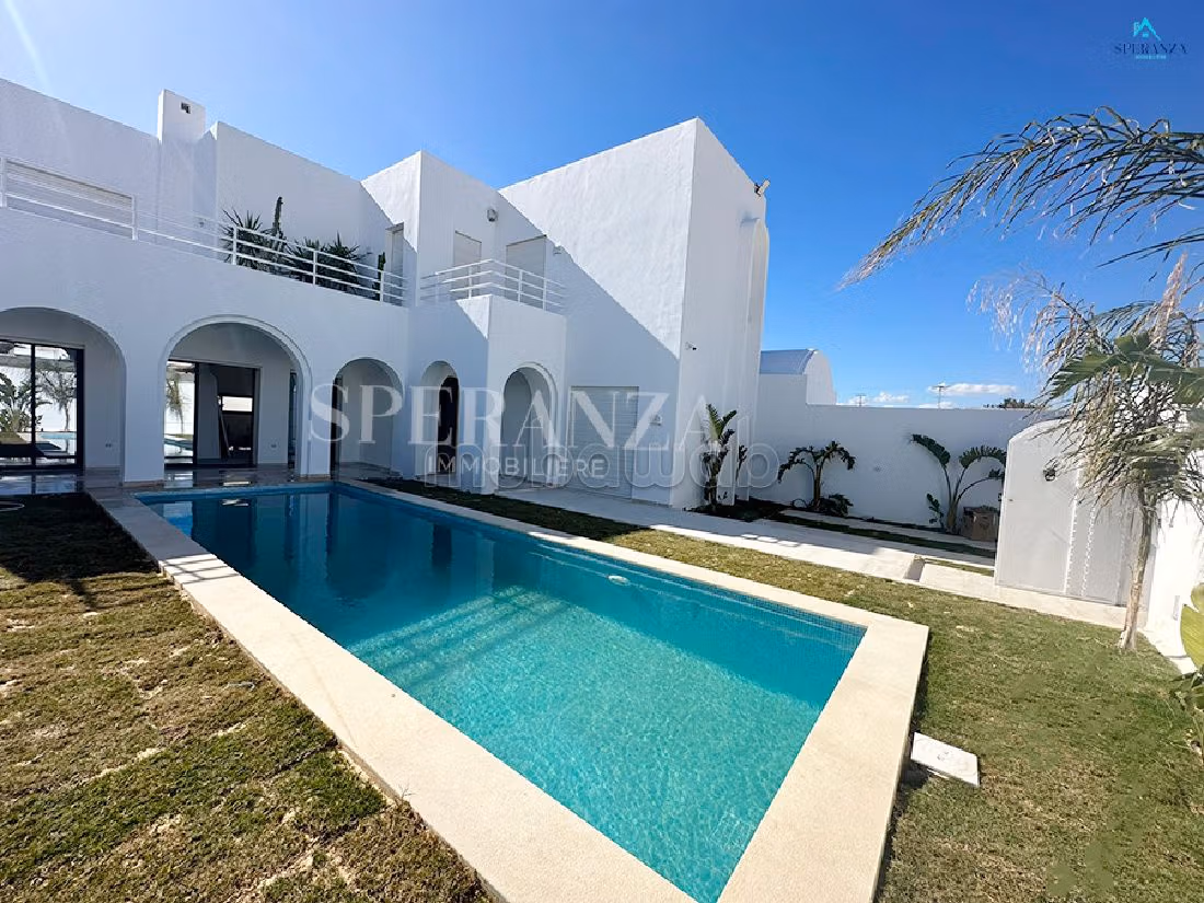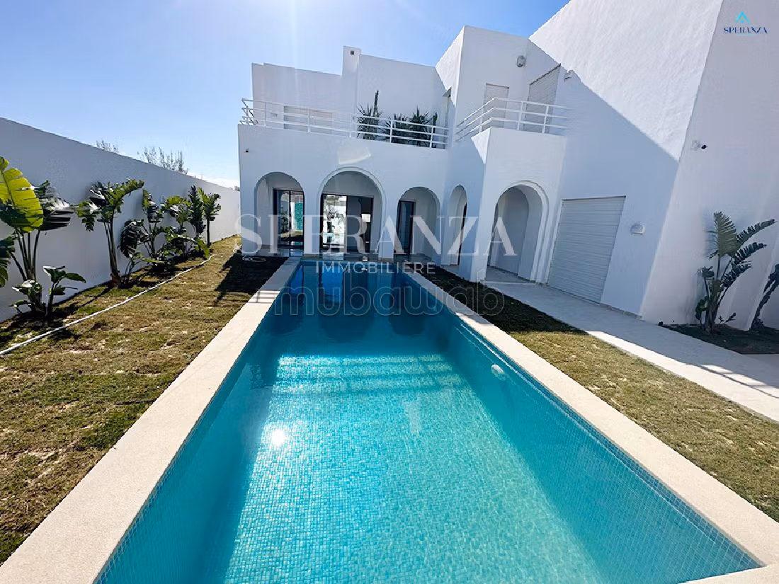 Speranza immobilière Hammamet vous propose la vente Cette villa se situé à Hammamet. L'entrée bénéficie d'un jardin gazonné aves qui offre plusieurs espaces de détente dispose d’un piscine Au rez de chausser se trouve un salon spacieux grâce ses grandes ouvertures kitchenette bien équipé une chambre ,salle d'eau .Un escalier nous mène vers 1 ér étage qui se compose de deux suite parentales avec terrasse .abri de voiture .