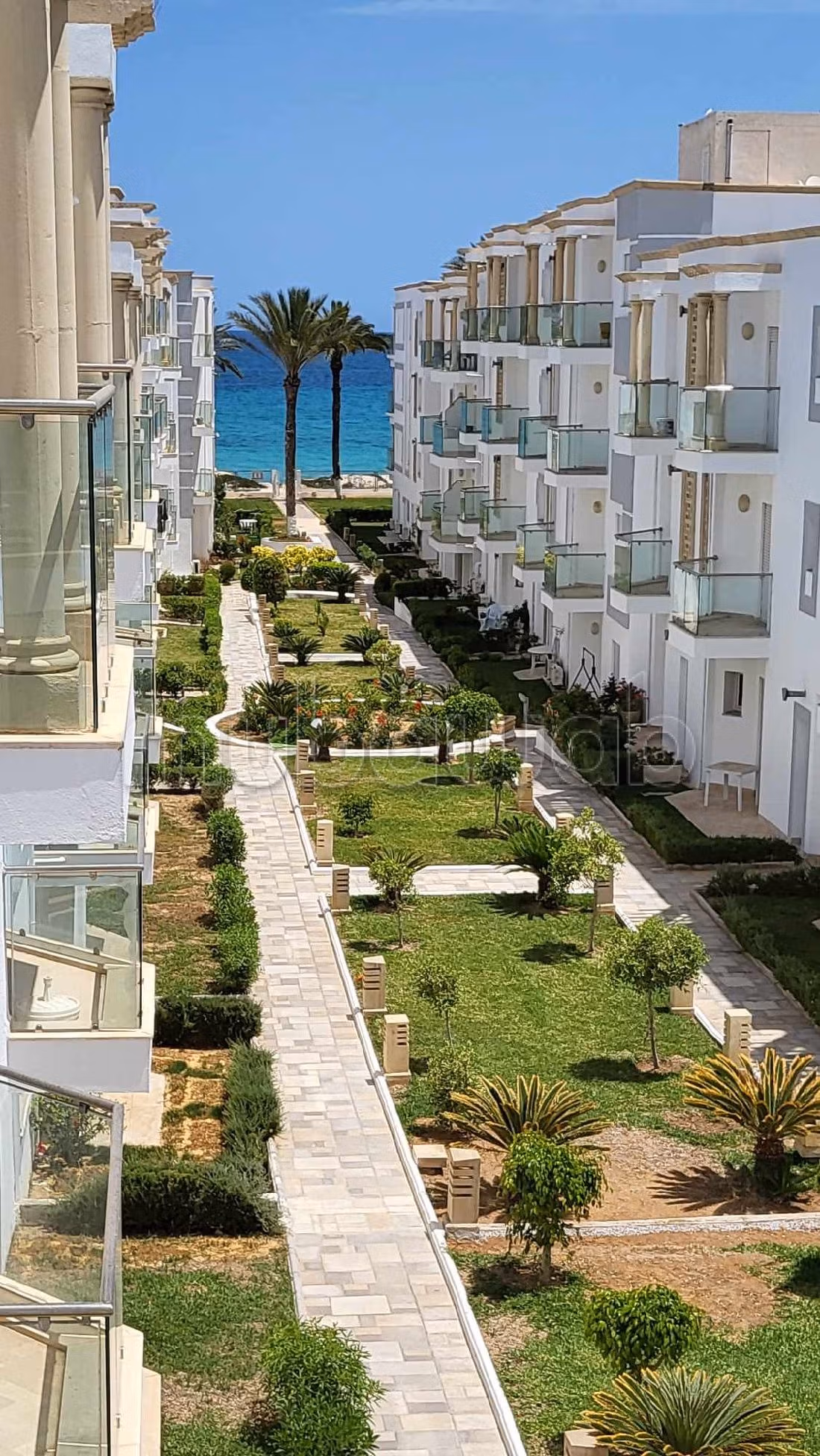 La résidence est de taille moyenne et comporte une piscine et un espace vert familial donnant sur la plage.