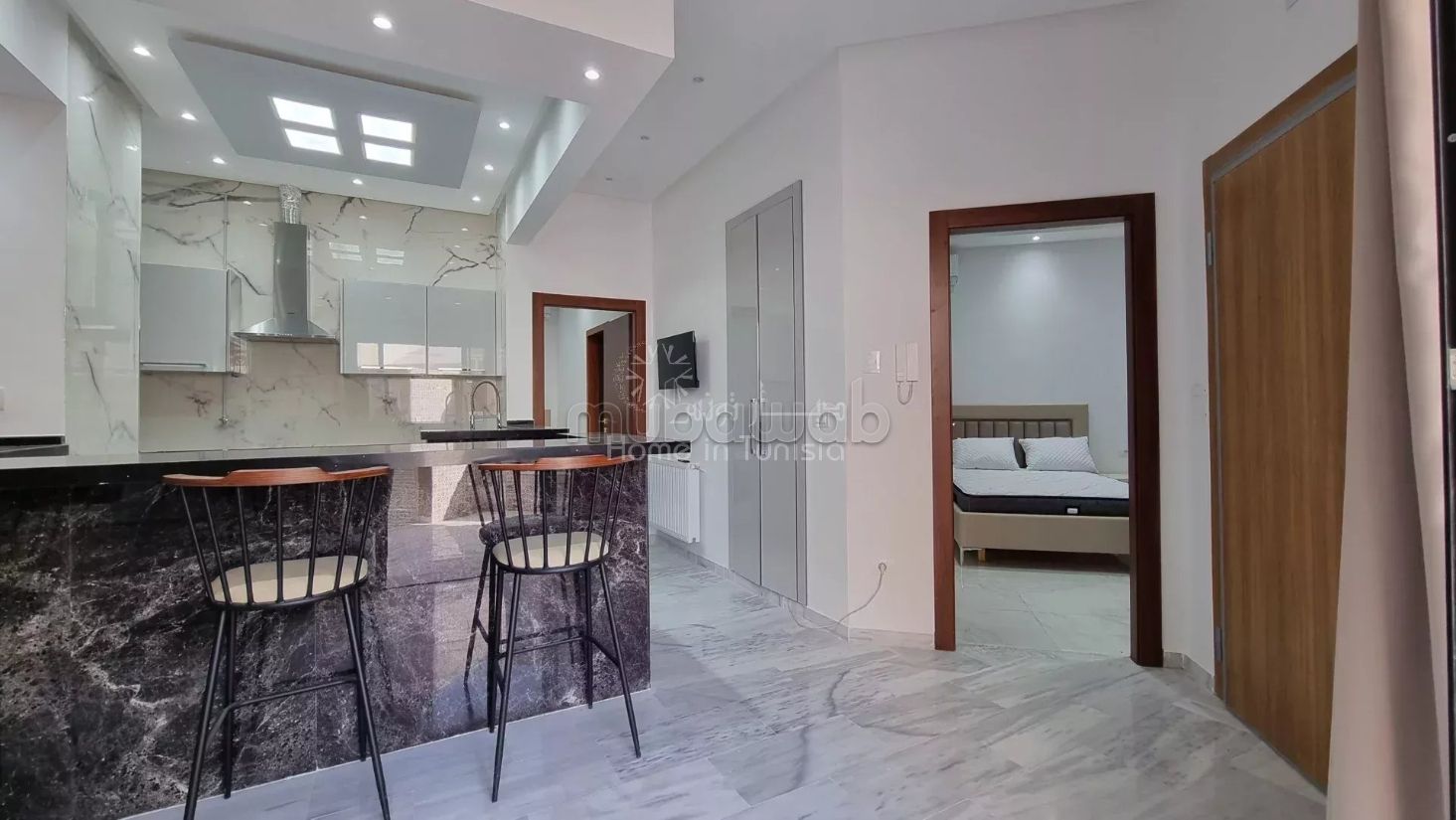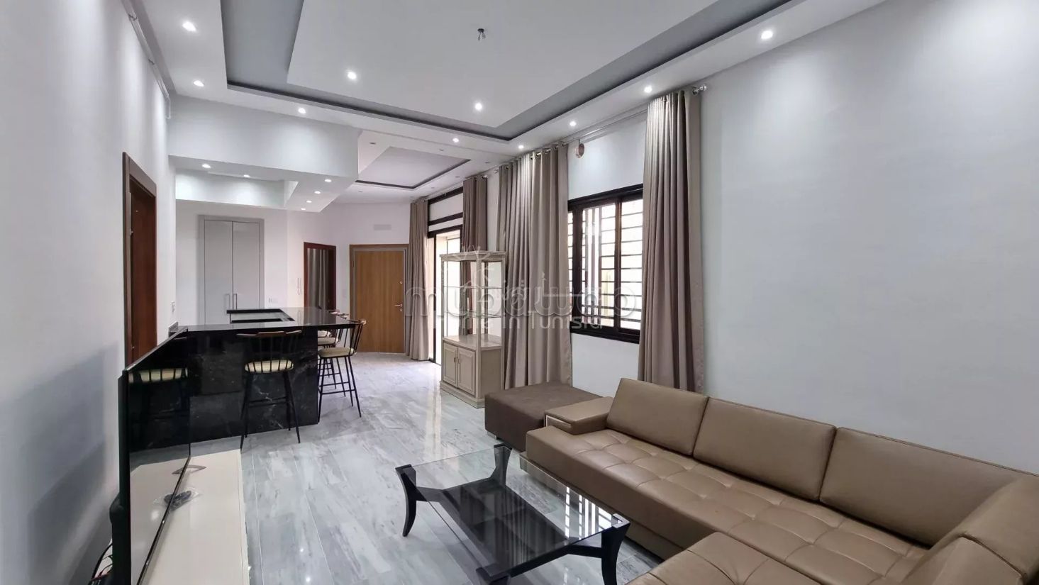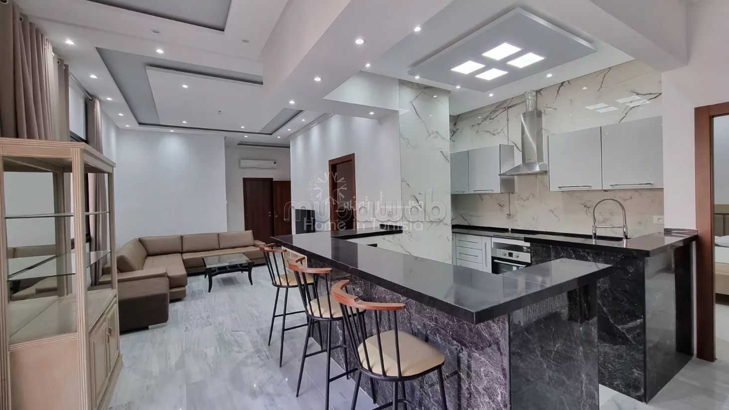 Un spacieux salon lumineux, ouvert sur une cuisine entièrement équipée.