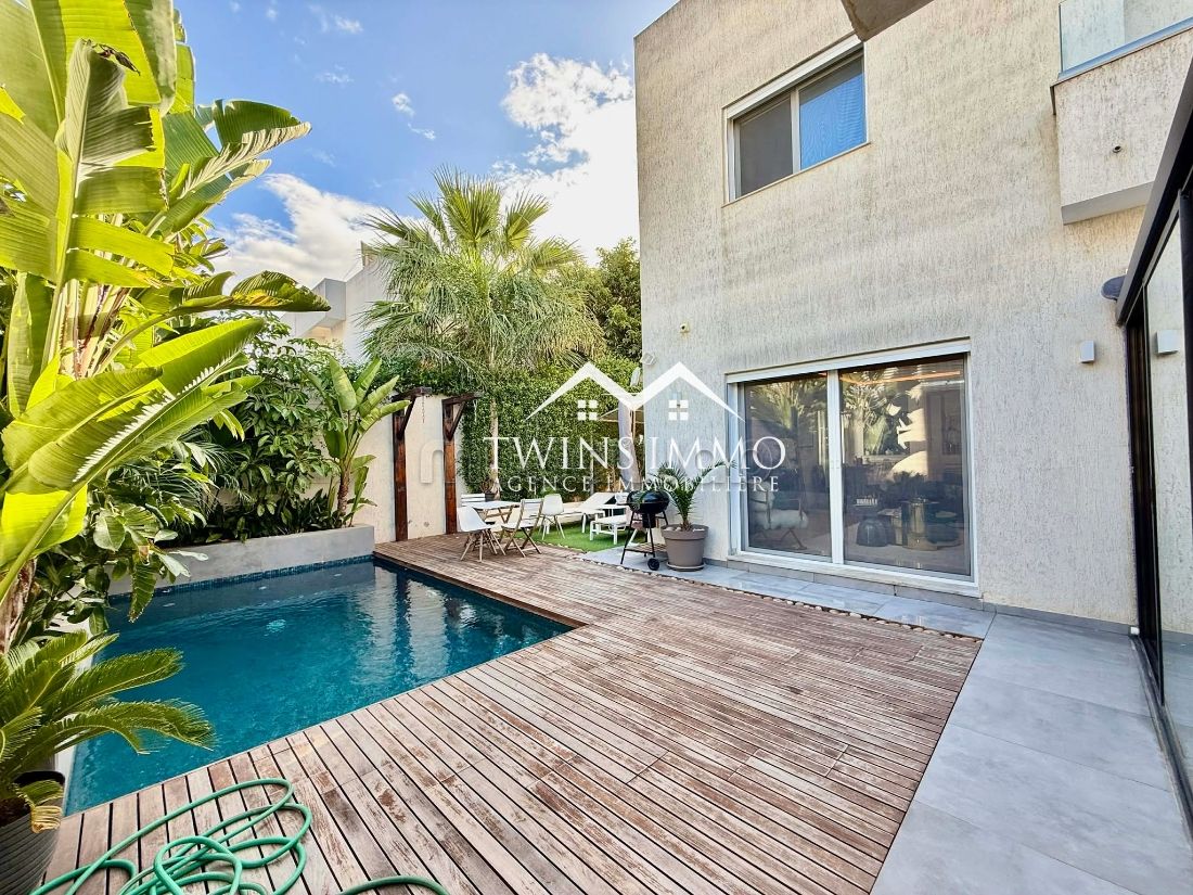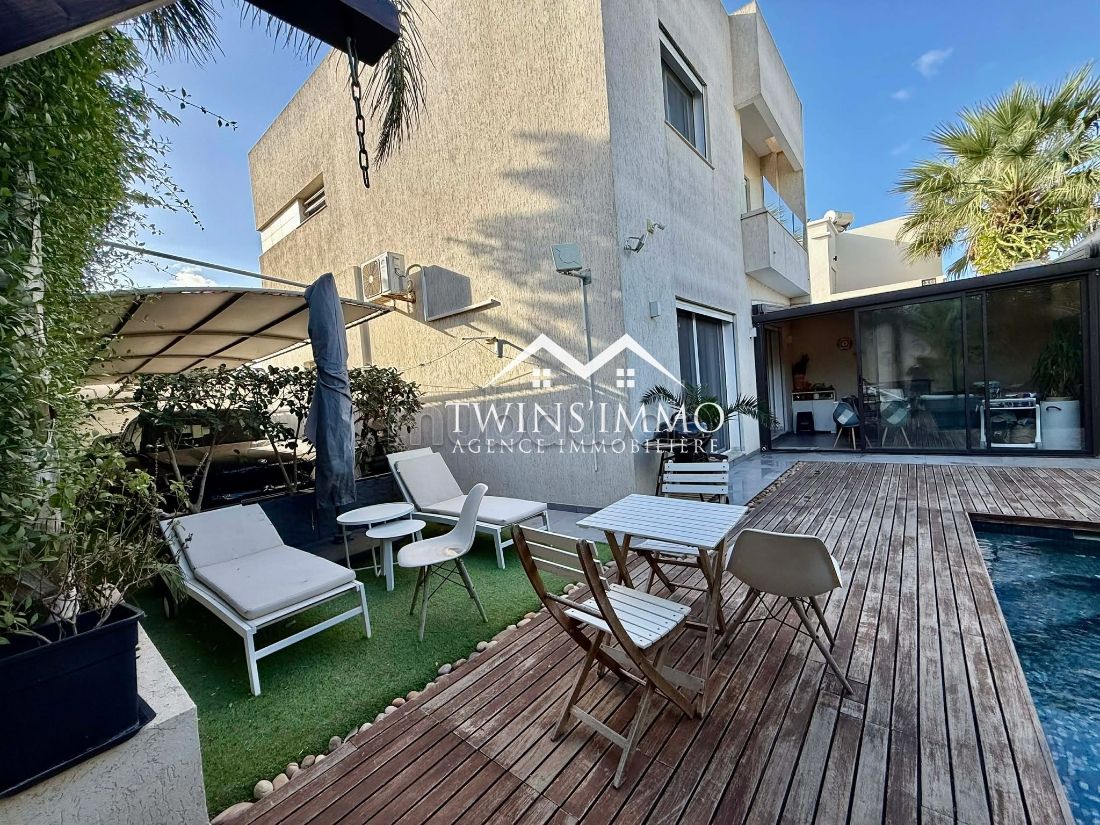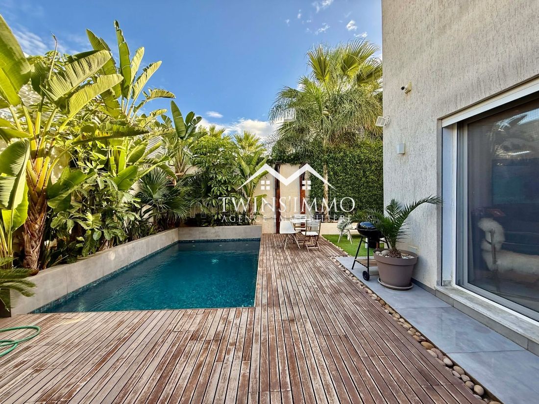 À l’extérieur, la villa dispose d’un jardin entretenu, d’une piscine, d’une grande terrasse aménagée et d’un garage pouvant accueillir deux voitures.