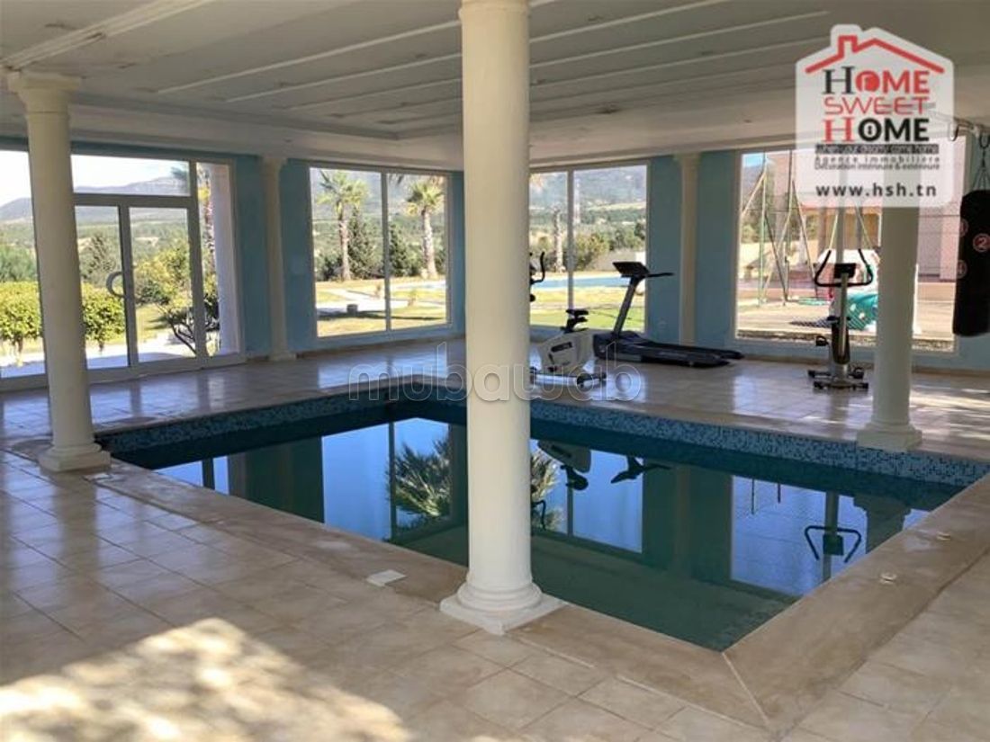 Villa de maître de plein pieds sur un terrain d'une superficie de 10000m² qui est arboré d'oliviers, de palmiers et de divers arbres fruitiers, sur les hauteurs de Mornag, avec une vue imprenable sur le mont de Boukornine, disposant de 2 piscines : une à l'extérieur et une à l'intérieur, on trouve un bungalow S2 à l'extérieur pour les invités et un duplex pour les ouvriers, on trouve ainsi une cuisine extérieure avec un bar donnant sur la piscine. Contacter l'agent: 56640310