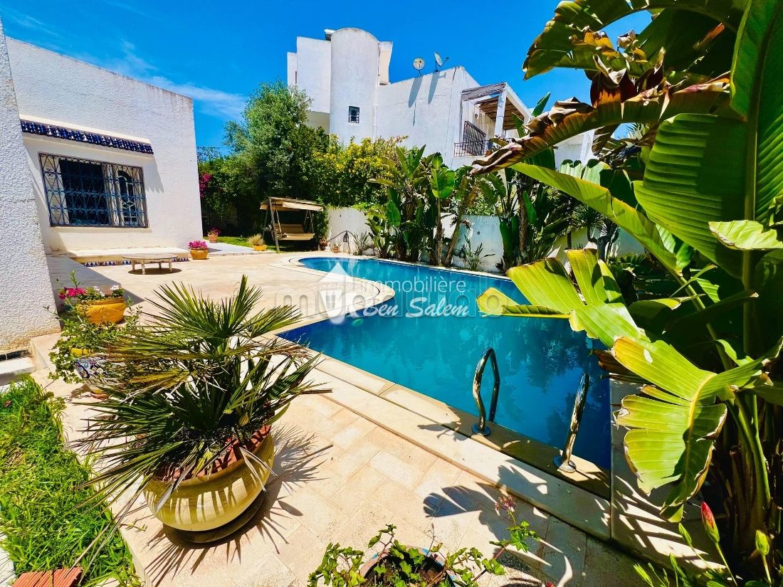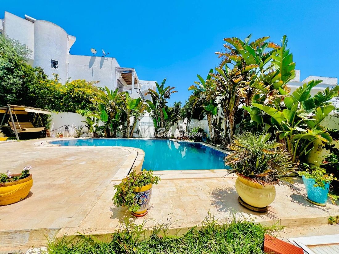 Un grand salon et salle à manger qui donne sur une belle terrasse et piscine bien décorée, deux chambres à coucher et une salle de bain une cuisine bien équipée et une salle d’eau.