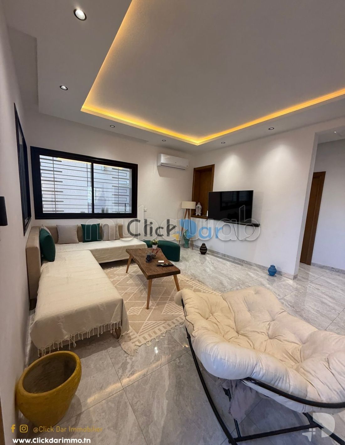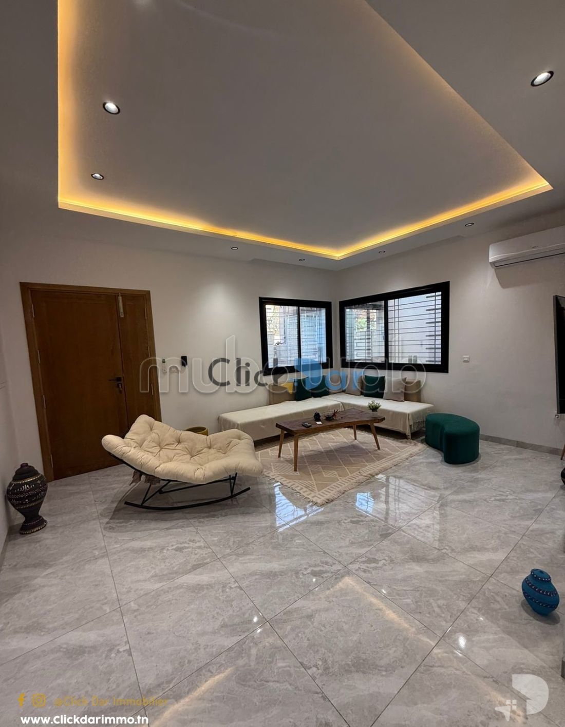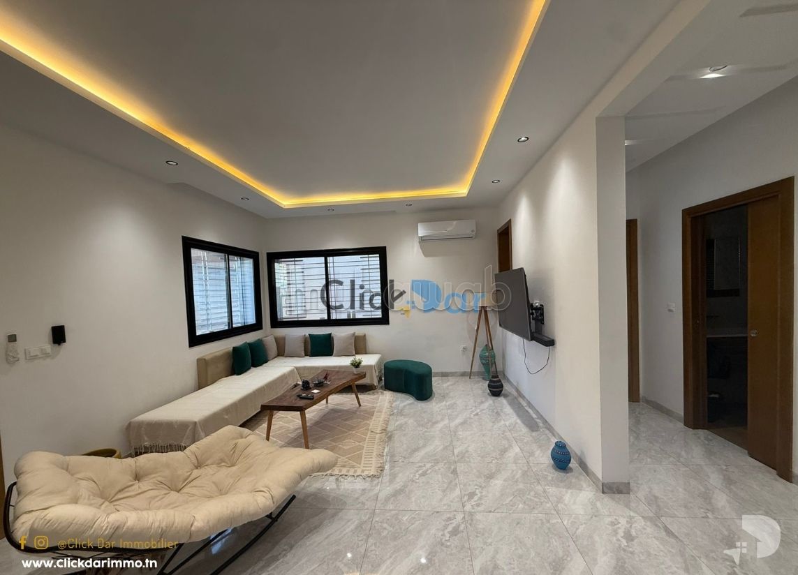 Click Dar Immobilier Hammamet vous propose pour la vente un RDC en S2 avec entrée indépendante et abri voiture situé à la zone touristique Hammamet sud, 10 min à pied de la plage .