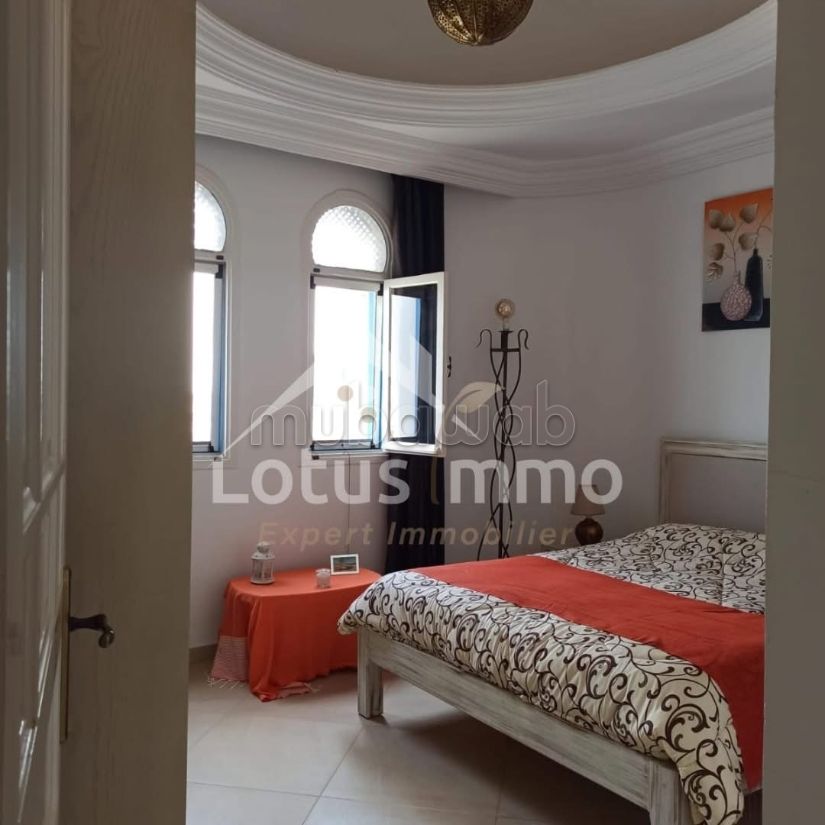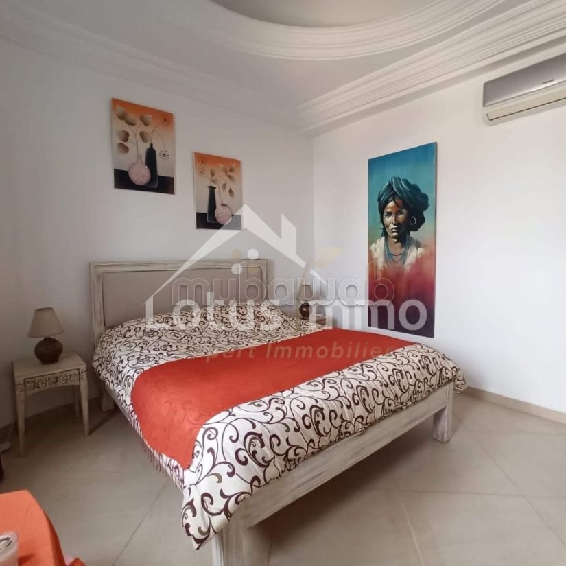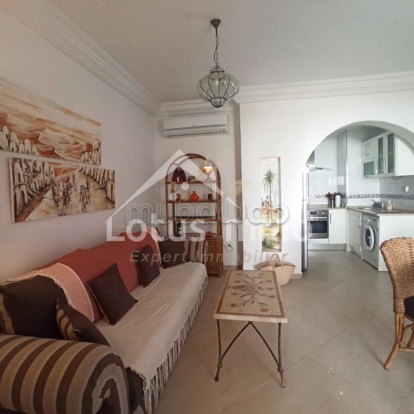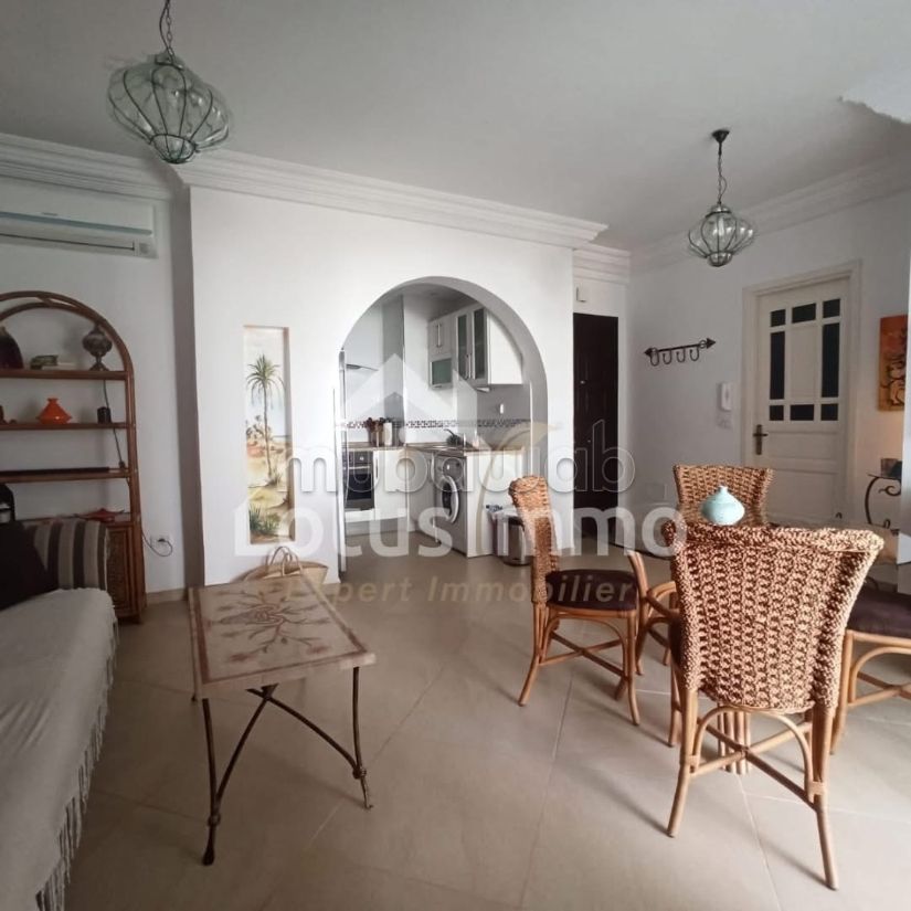 Lotus Immo Djerba offre in affitto annuale un appartamento S1 arredato situato in una residenza sicura con piscina comune e vista mare, in prossimità immediata della Clinica El Chifa.