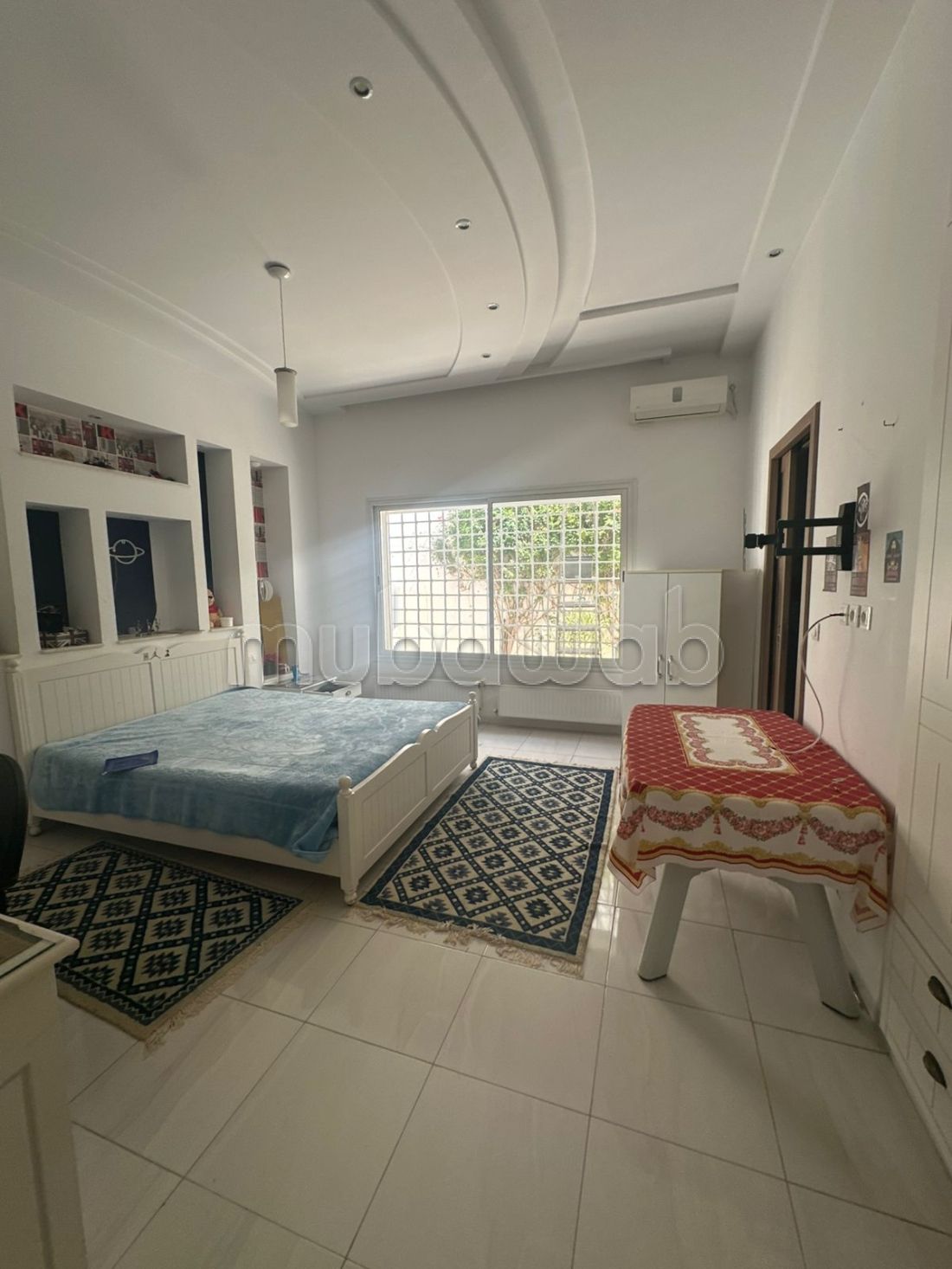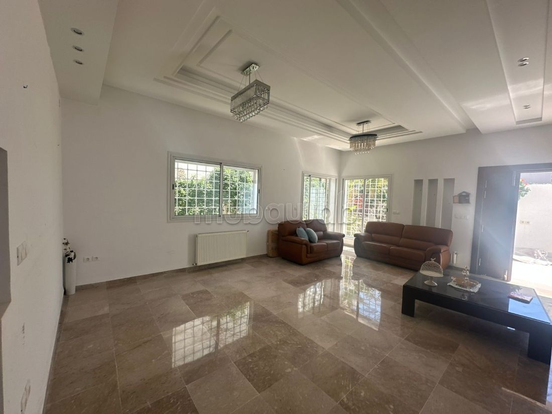 In affitto piano terra di villa arredato di alto standing a Sousse Bouhacina, vicino a scuola francese in quartiere residenziale, un ingresso principale che si apre su un ampio soggiorno che si affaccia su un'area giardino, la parte giorno è dotata di un soggiorno abbellito da un camino, sala da pranzo, uno studio, bagno doccia, cucina arredata e attrezzata con una spaziosa terrazza. La parte notte comprende due suite spaziose con bagni e cabine armadio. Il piano terra è dotato di riscaldamento centrale e aria condizionata a split, un'area giardino, un ingresso indipendente con due posti auto.